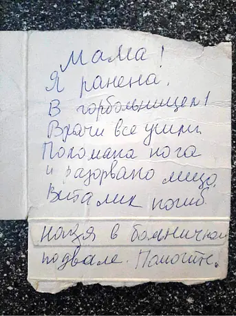 «Мамо! Я поранена. У міській лікарні №1. Лікарів вже немає. Зламана нога і розірване обличчя. Віталік загинув. Надя – у підвалі лікарні. Допоможіть!»