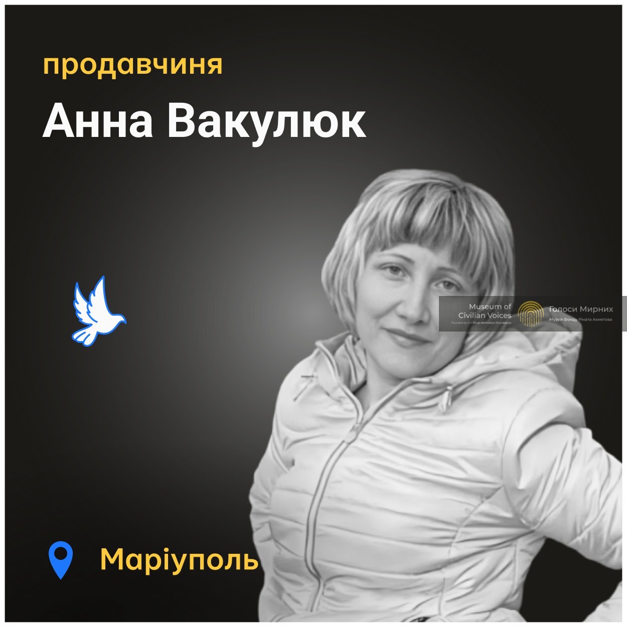 50-річна Анна Вакулюк загинула з сином Іваном 13 березня 2022 року у дворі житлового будинку в Маріуполі. Обстріл застав їх, коли готували їжу біля під’їзду. Поряд загинуло ще троє людей. П’ятиповерхівка, де мешкали Вакулюки, згоріла.