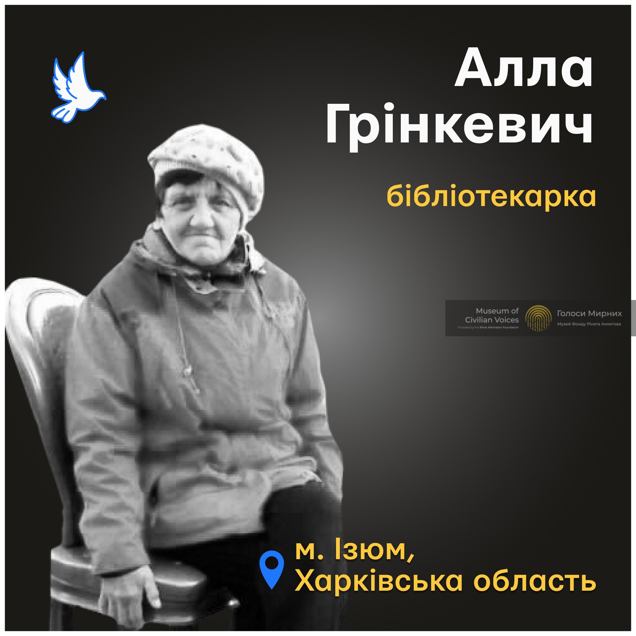 Аллі Грінкевич було 70 років. Жінка загинула під завалами будинку на Першотравневій, 2. Разом з іншими мешканцями вона ховалась від російських обстрілів у підвалі, але це не вберегло 9 березня, коли росіяни обстріляли будинок з танка та завдали авіаударів по ньому. Жертвами цієї атаки стали понад 50 людей.