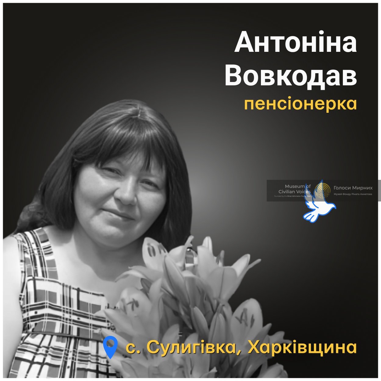 67-річна Антоніна Вовкодав загинула у власній спальні у селі Сулигівка Ізюмського району Харківщини. 19 березня 2022 року російські війська скинули на її дім бомбу.