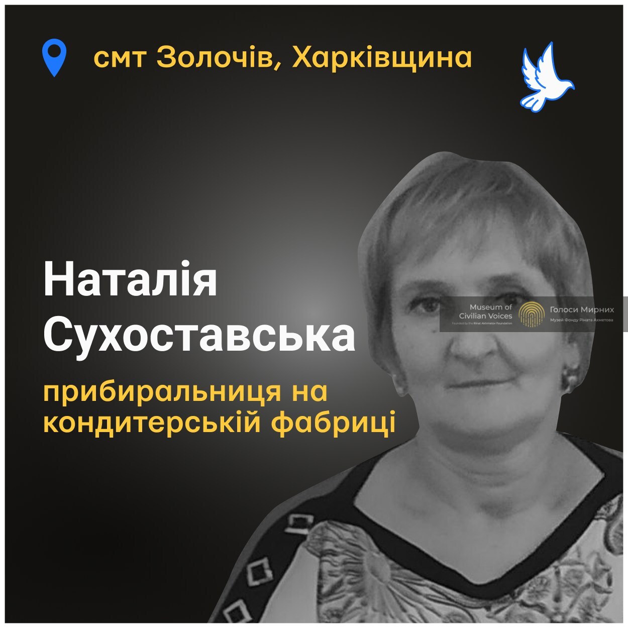 56-річна Наталія Сухоставська загинула в Золочеві на Харківщині 10 березня 2022 року. Того дня росіяни обстріляли населений пункт з артилерії. Ворог атакував житловий масив біля місцевої церкви. Наталія загинула від снаряда, який влучив у будинок, повз який вона проходила. Це була друга загибель цивільної людини в Золочівській громаді під час повномасштабної війни.