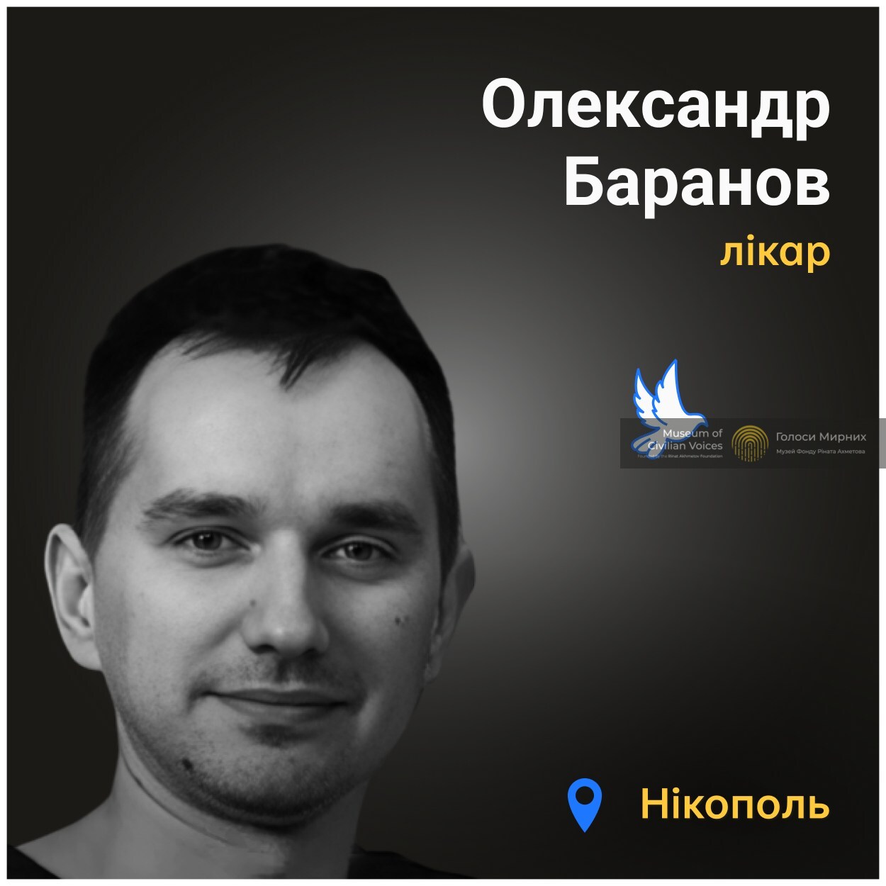 Життя лікаря сімейної медицини Олександра Баранова відібрав російський обстріл міста Нікополь Дніпропетровської області 11 листопада 2024 року. Ворожий снаряд влучив у медичну амбулаторію.