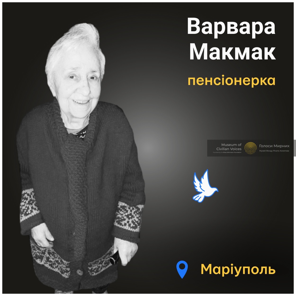 Варвара Макмак загинула від авіаудару по Маріуполю у квітні 2022-го. Варварі Михайлівні було 92 роки. Онука Олена Дубровська розповіла, що її бабусю забрали до моргу, а поховали лише через два місяці. Де могила – родина не знає. Так само Олені невідомі точні обставини загибелі бабусі.