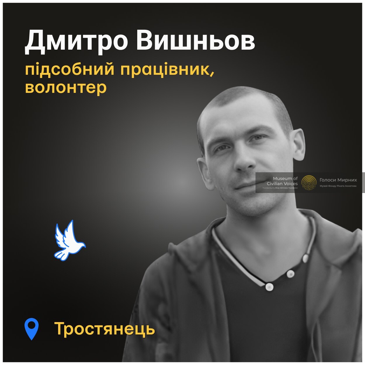 40-річний Дмитро Вишньов загинув у Тростянці на Сумщині. 10 березня 2022 року його схопили російські військові. Дмитра катували. Його тіло виявили в гаражі поблизу Тростянецької районної адміністрації на другий день після звільнення міста з російської окупації – 27 березня 2022 року.