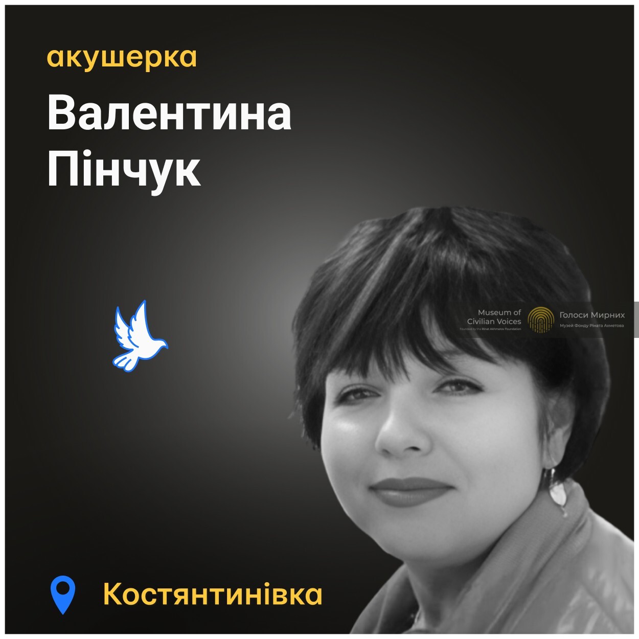 Валентині Пінчук було 60 років. Вона народилася на Донеччині. Працювала акушеркою акушерсько-гінекологічного відділення багатопрофільної лікарні інтенсивного лікування Костянтинівської міської ради. Мала багато друзів. Ті, хто знав її, пригадують її надійною товаришкою, доброзичливою та порядною людиною.