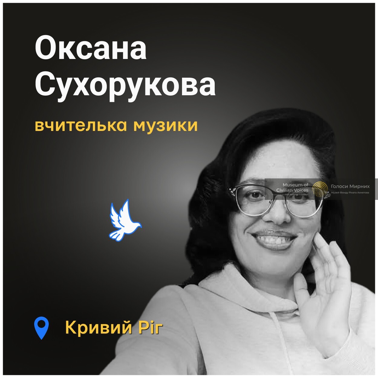 Оксані Сухоруковій було 45 років. Учителька музичного мистецтва – понад 20 років працювала у Криворізькій гімназії №114. Обожнювала рукоділля, особливо любила вʼязати. Була світлою і чуйною. Любила своїх учнів, поважала колег. Мала тісний звʼязок з мамою Аллою.