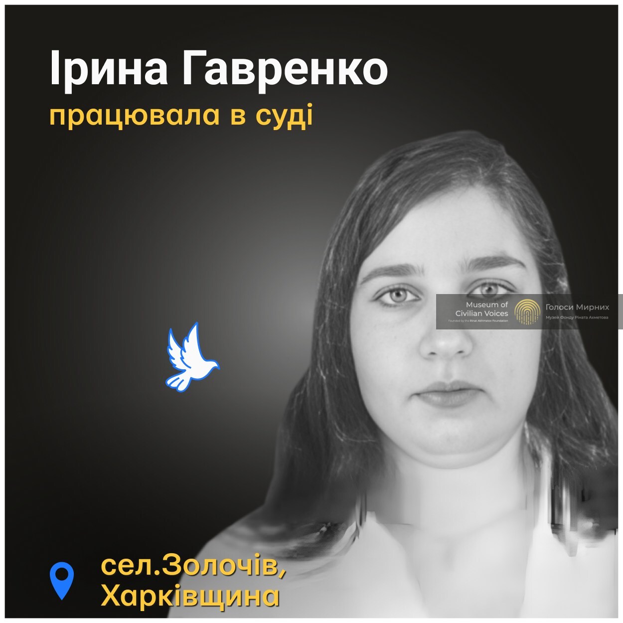 Ірині Гавренко було 38 років. Народилася у селі Одноробівка, що на Харківщині. Жила в селищі Золочів. Працювала у суді.