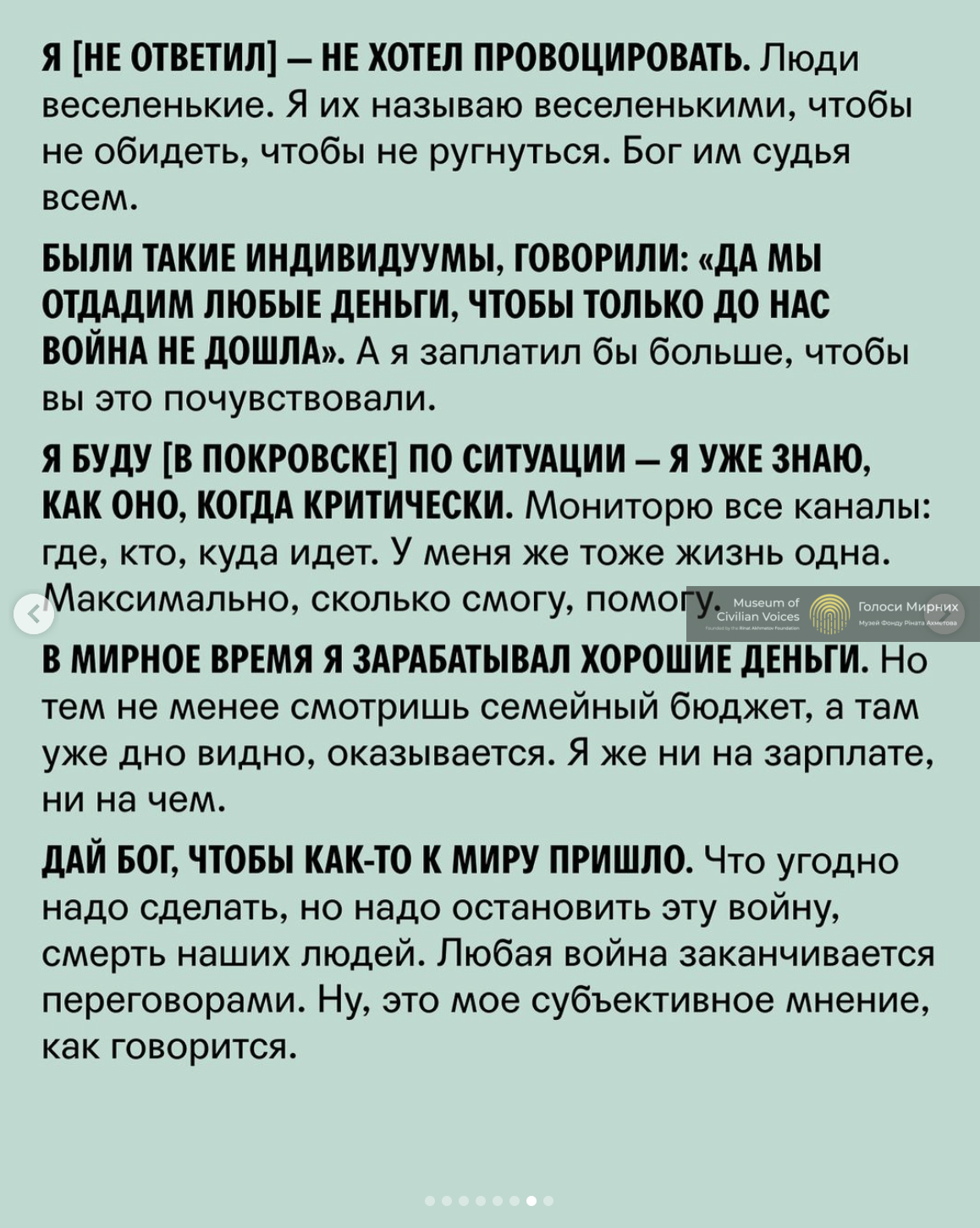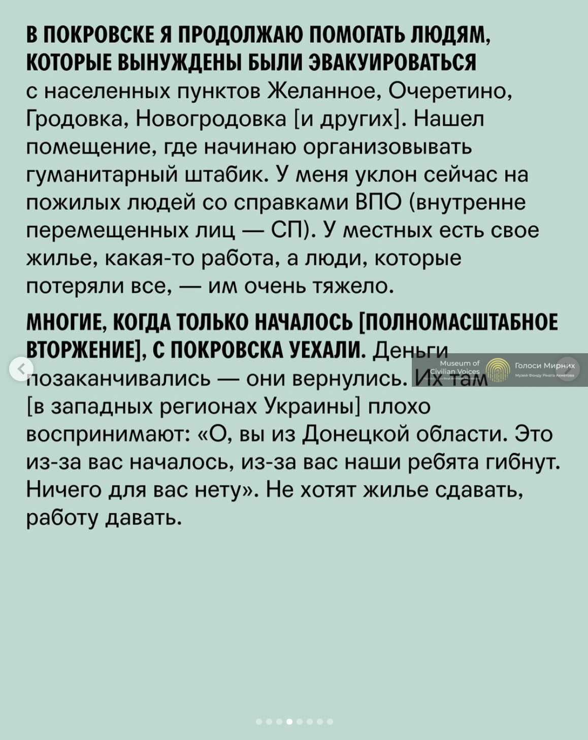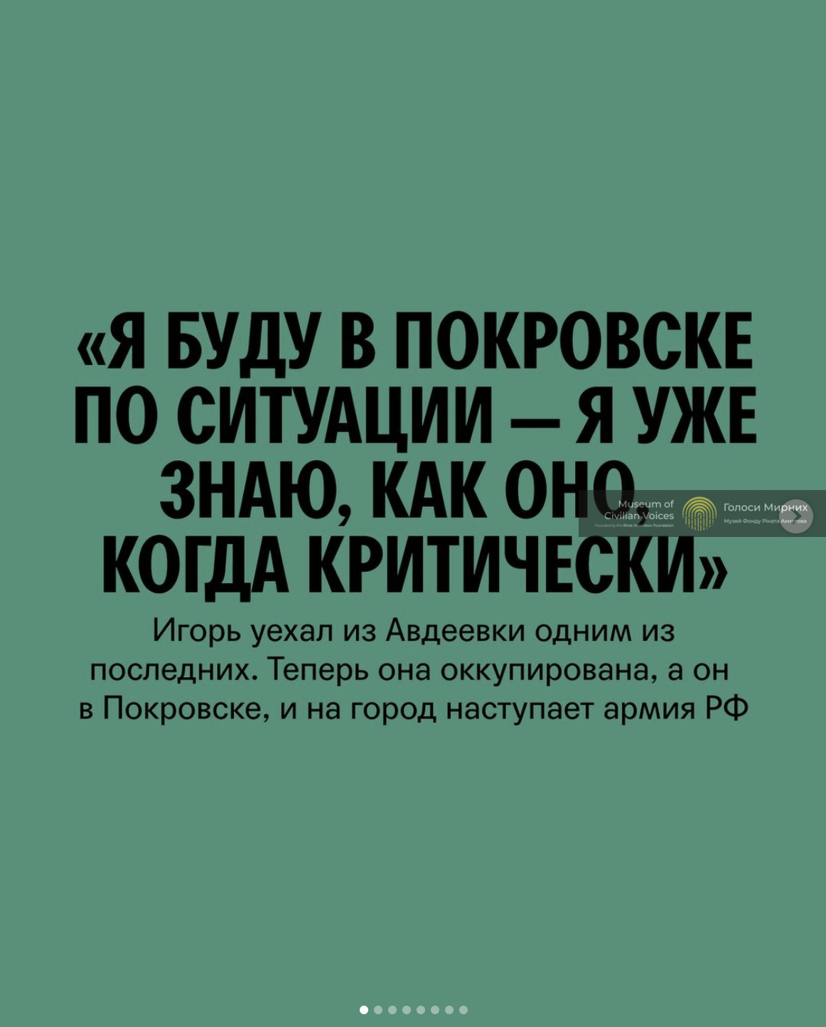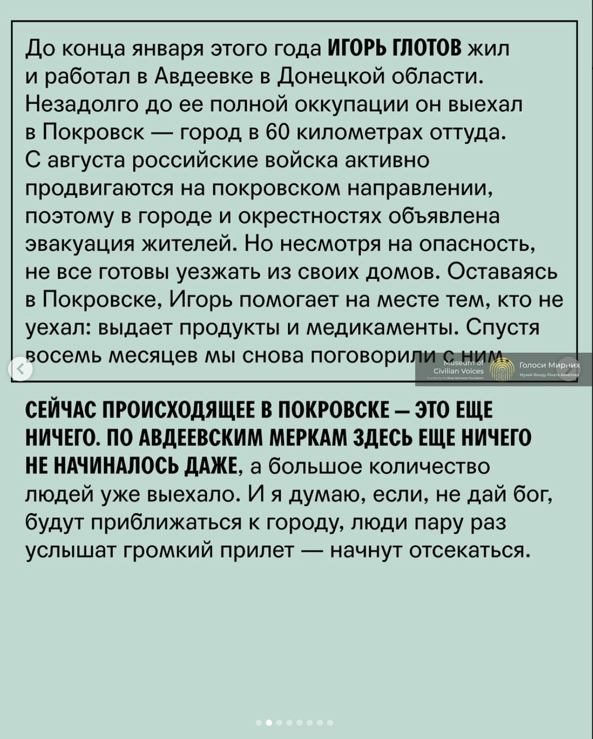 До конца января этого года Игорь Глотов жил и работал в Авдеевке в Донецкой области. Незадолго до ее полной оккупации он выехал в Покровск – город в шести километрах оттуда. С августа российские войска активно продвигаются на покровском направлении, поэтому в городе и окрестностях объявлена эвакуация жителей. Но несмотря на опасность, не все готовы уезжать из своих домов. Оставаясь в Покровске, Игорь помогает на месте тем, кто не уехал: выдает продукты и медикаменты. Спустя восемь месяцев мы снова поговорили с ним.