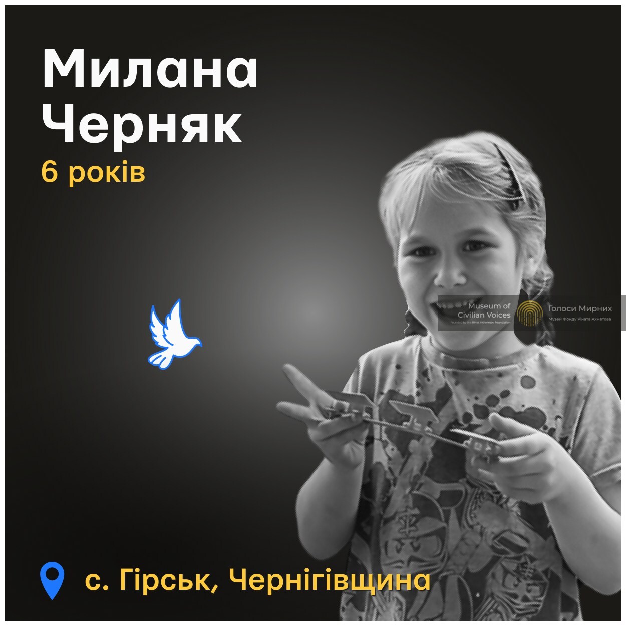 Життя Милани Черняк відібрала російська армія 3 жовтня 2024-го. Дівчинці було шість років. Вона жила у прикордонному селі Гірськ на Чернігівщині. Туди приїхала автівка з газом. Зупинилася біля будинку родини Милани, коли російські військові зробили чотири постріли зі ствольної артилерії. Зайнялася пожежа.