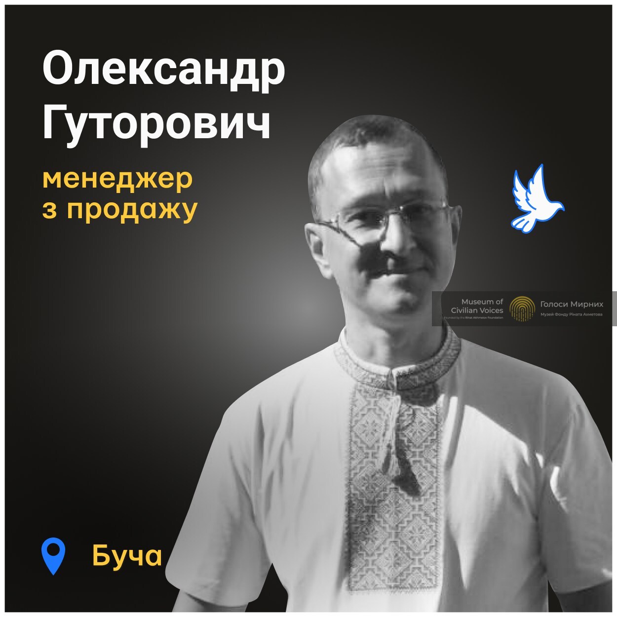 46-річного Олександра Гуторовича розстріляли російські військові під час спроби евакуації з Бучі. Ймовірно, це сталося 14 березня. Саме тоді Олександр востаннє вийшов на зв'язок зі своєю дружиною Оленою.