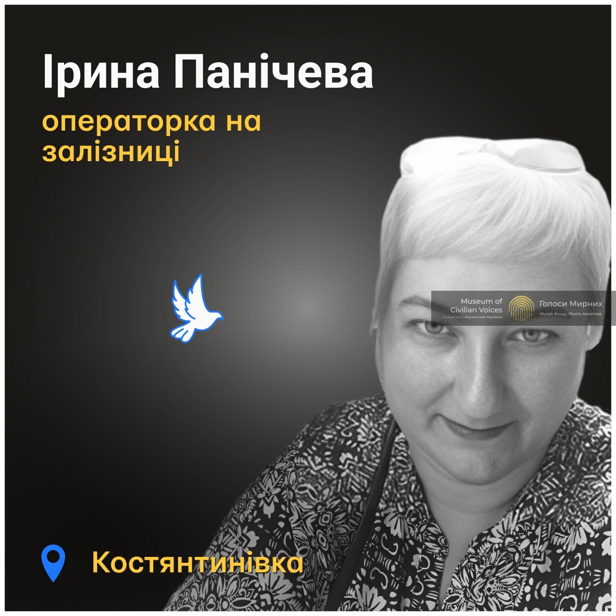 Ірині Панічевій було 44 роки. Вона народилася у Костянтинівці. Закінчила Бахмутський коледж транспортної інфраструктури. Майже 16 років років працювала на Укрзалізниці операторкою поста централізації 4 розряду. Колегам запам’яталась відповідальною, чуйною та доброю.