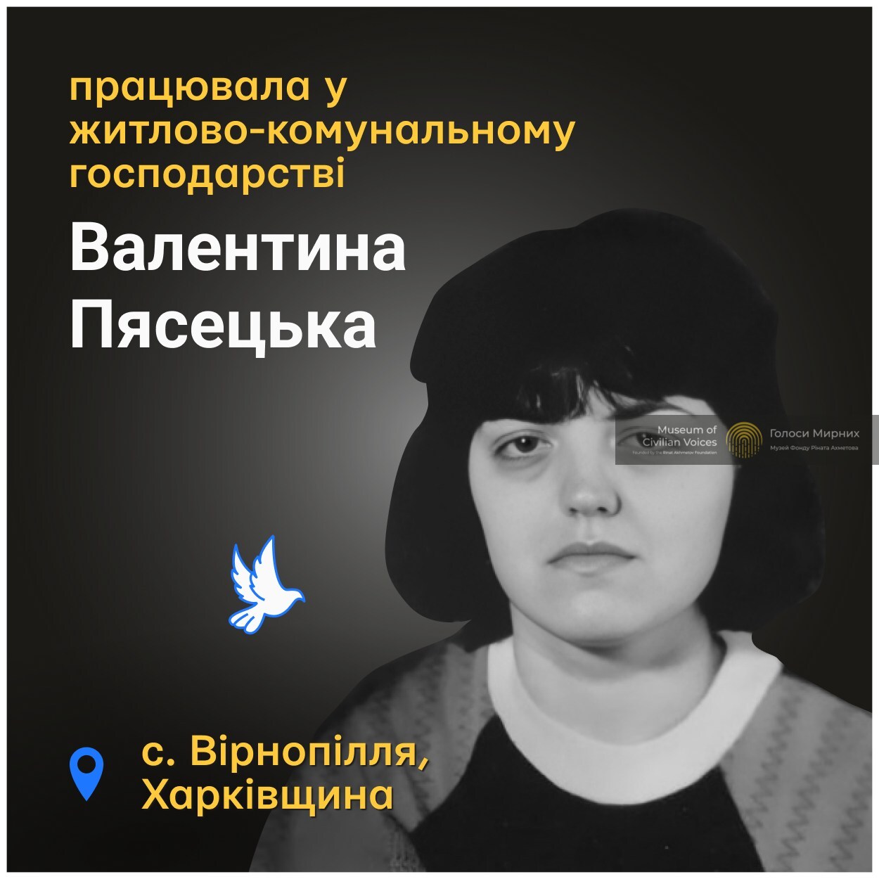 54-річна Валентина Пясецька загинула у селі Вірнопілля біля Ізюма на Харківщині 5 травня 2022 року. Вона з донькою ховалася в погребі від обстрілів російських військ, які наступали. Один зі снарядів поцілив прямо в укриття з жінками та їхнім сусідом.