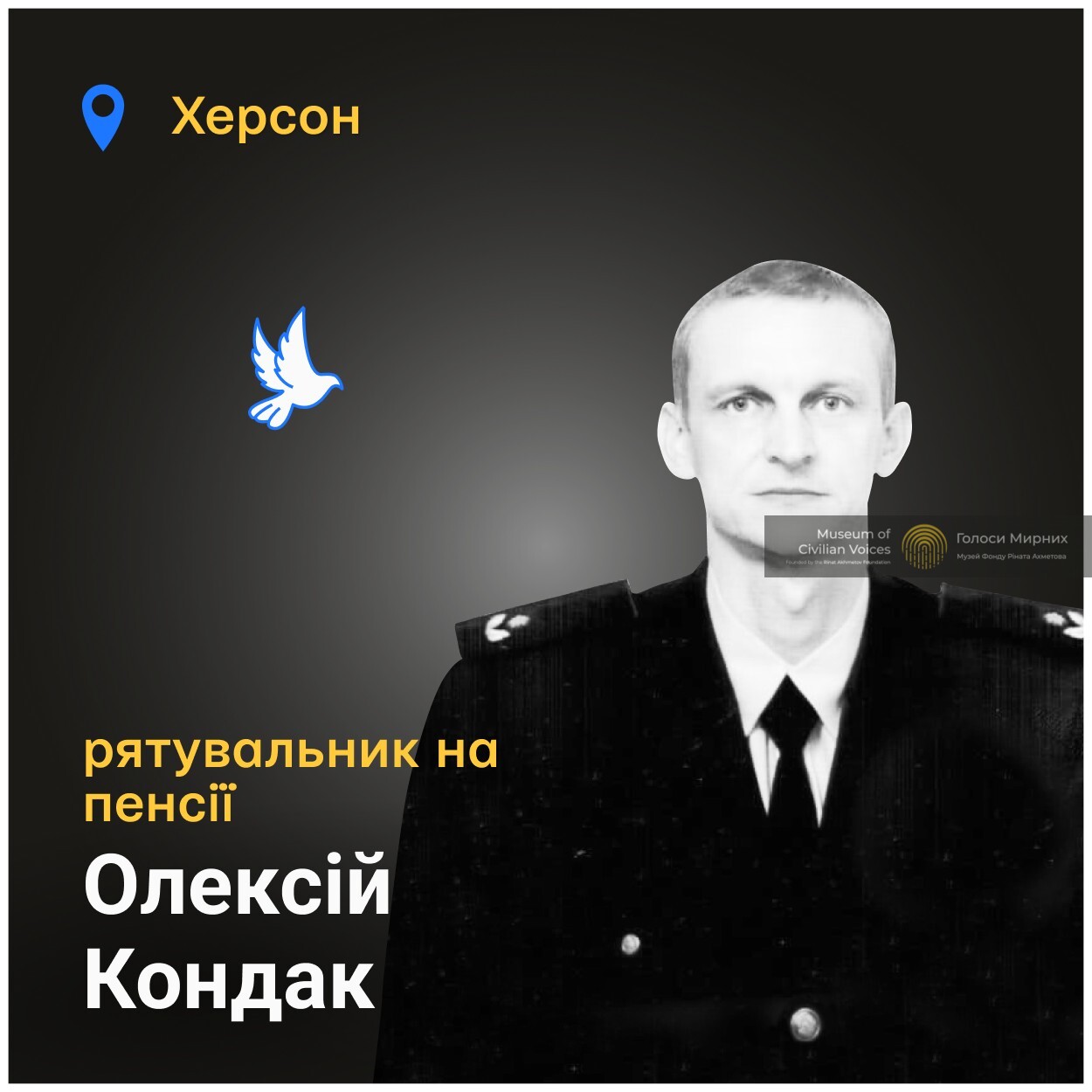 18 квітня 2023 року російська армія обстріляла в Херсоні ринок «Центральний» та навколишні будинки. 46-річний Олексій Кондак зі своїм батьком Володимиром того дня пішли на ринок, щоби купити запчастини. Від ворожих обстрілів Олексій загинув на місці. Ще дев’ятеро людей отримали поранення.