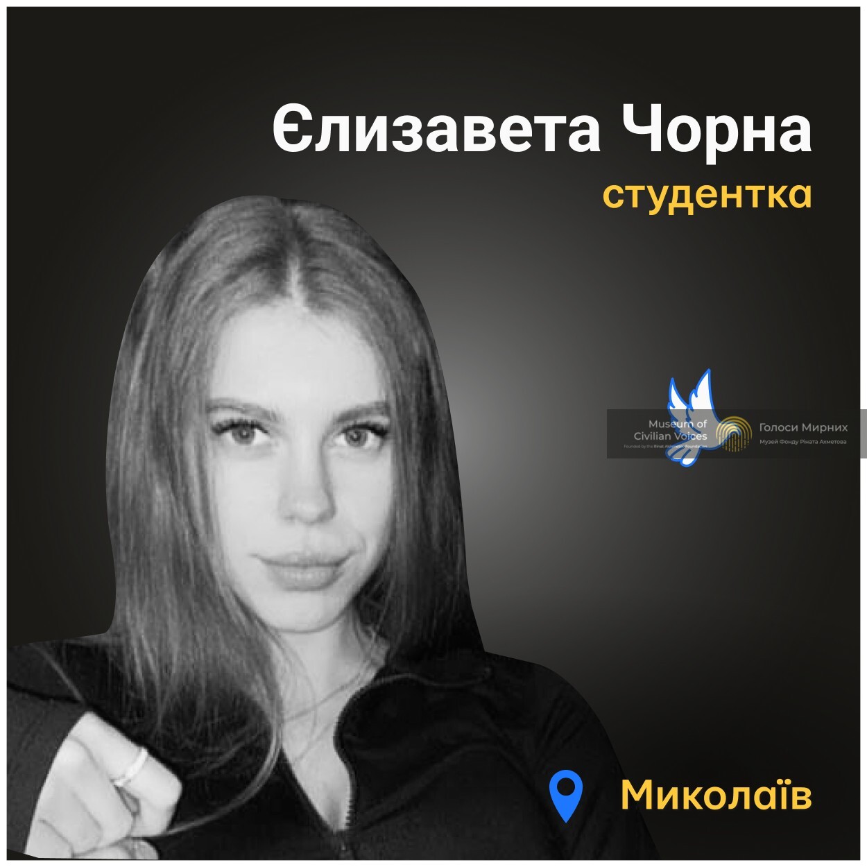 19-річна Єлизавета Чорна загинула в Миколаєві 7 березня 2022 року. Вона перебувала вдома, коли Росія завдала удару по місту. Снаряд потрапив у двір, а двері будинку, за якими ховалася дівчина, знесло вибуховою хвилею. Загинула також мама Єлизавети, Ольга, брат та бабуся – отримали поранення.