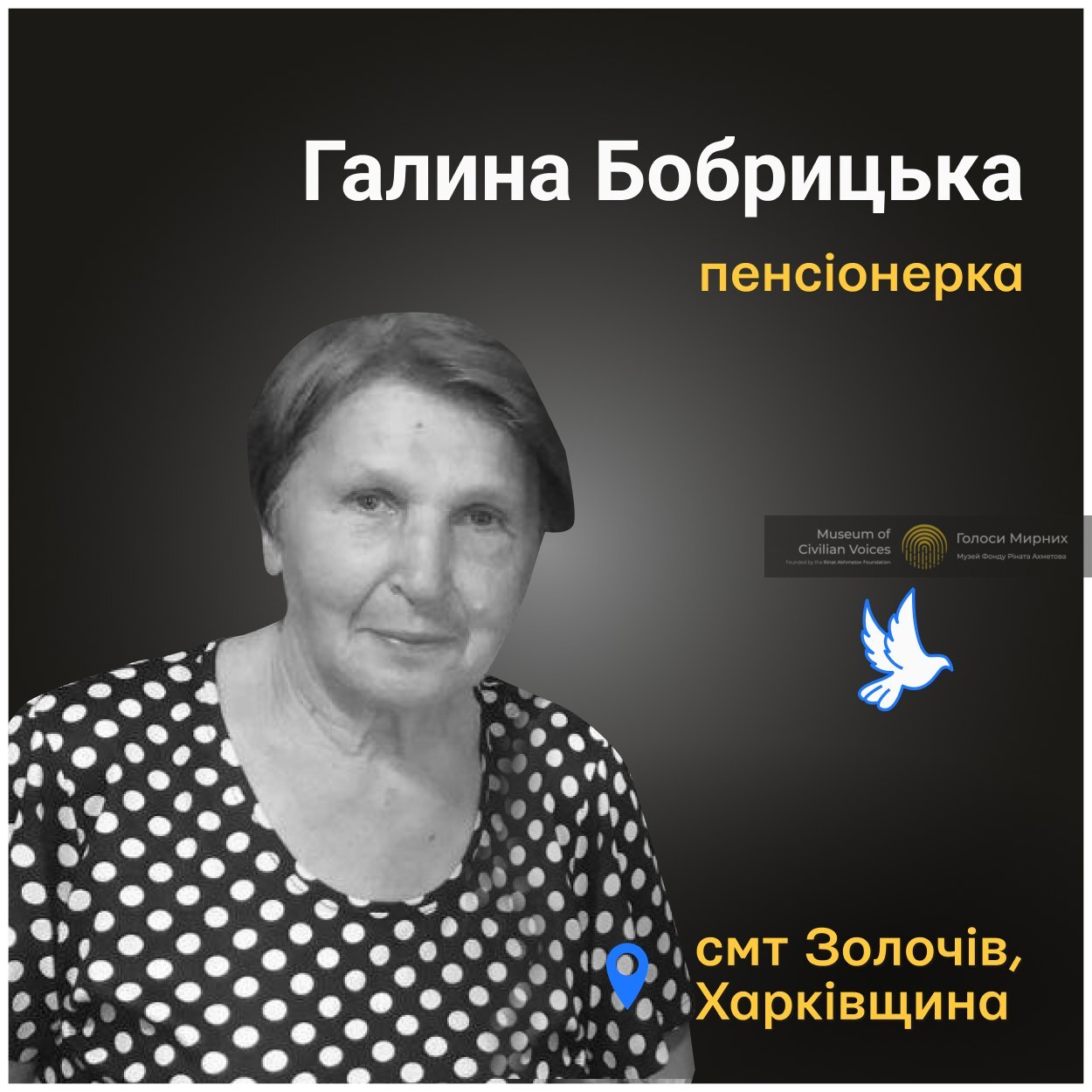 Галині Бобрицькій було 74 роки. Вона загинула 15 березня 2022 року біля свого будинку в Золочеві на Харківщині. Того дня росіяни обстріляли селище з артилерії. Галина Дмитрівна у момент обстрілу була на подвір’ї, поралася по господарству, її вбило уламками ворожого снаряда. Жінка померла на руках у свого чоловіка.