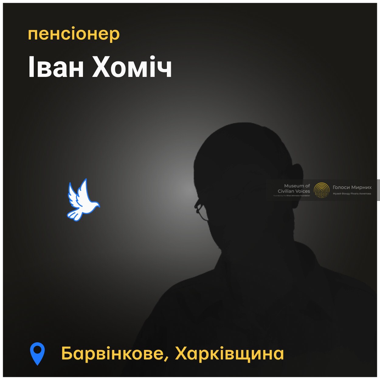 72-річний Іван Хоміч з міста Барвінкове Харківської області загинув через розрив міни біля свого двору. Трагедія сталася 12 квітня 2022 року. Того дня місто потерпало від обстрілів росіян, які наблизилися зі сторони Ізюму.