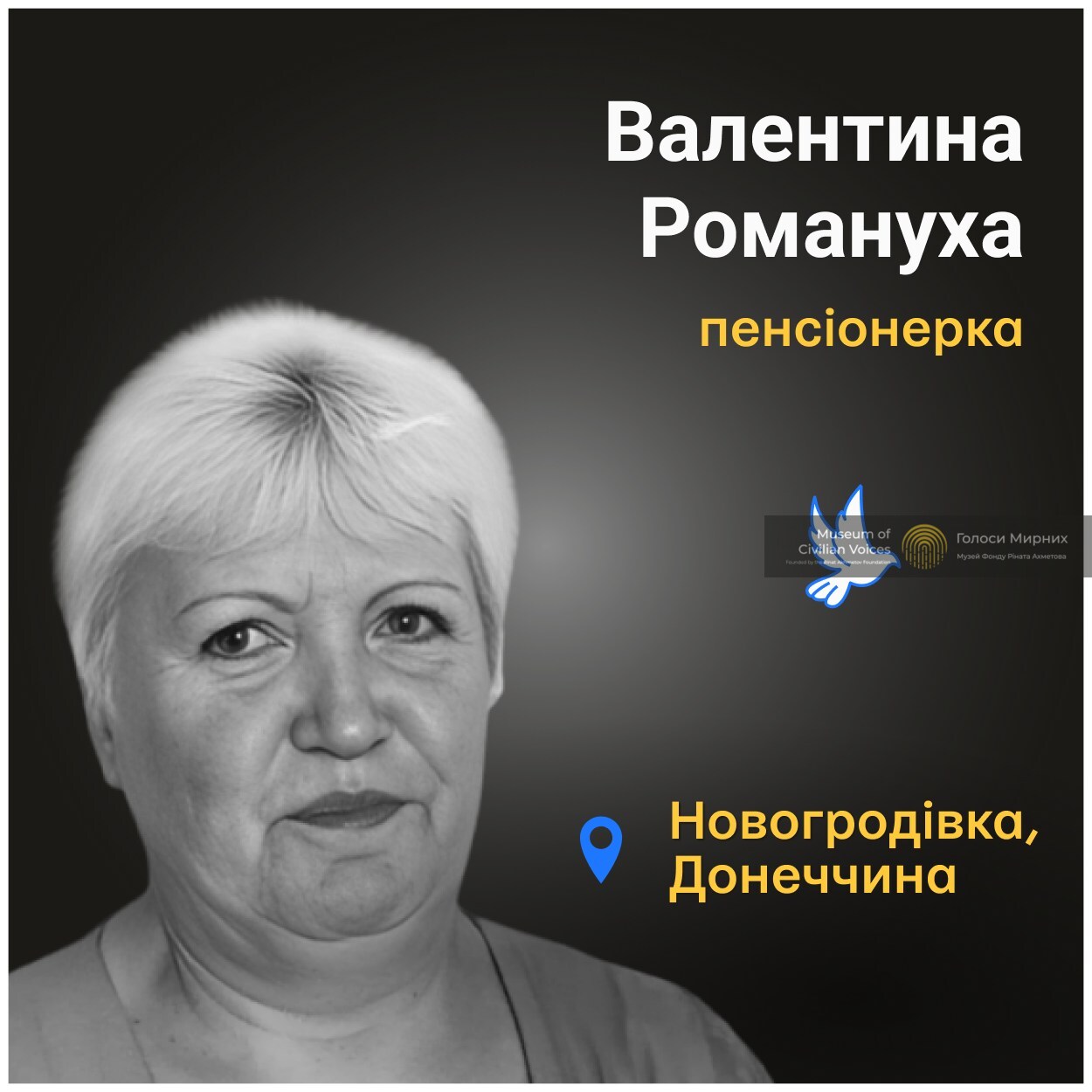 Валентина Романуха отримала смертельне поранення 21 березня 2024 року під час російського обстрілу міста Новогродівка, що на Донеччині. Поруч також не стало її цивільного чоловіка Миколи.