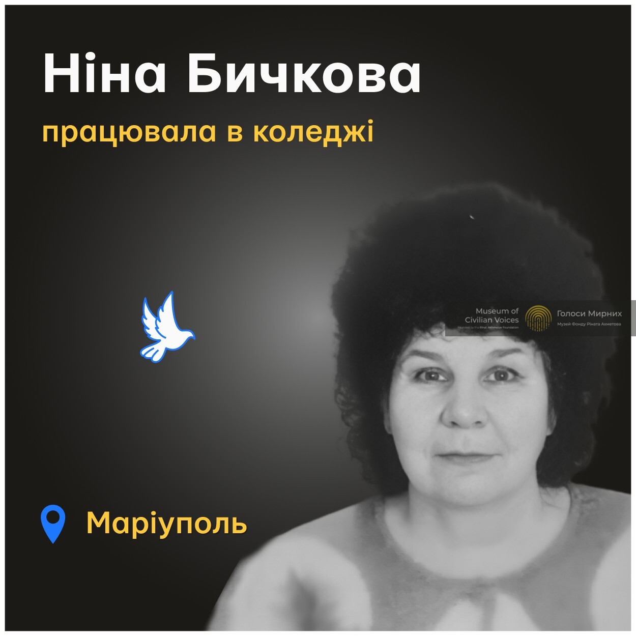 Ніна Бичкова загинула 18 березня 2022 року біля підвалу Маріупольського будівельного коледжу.