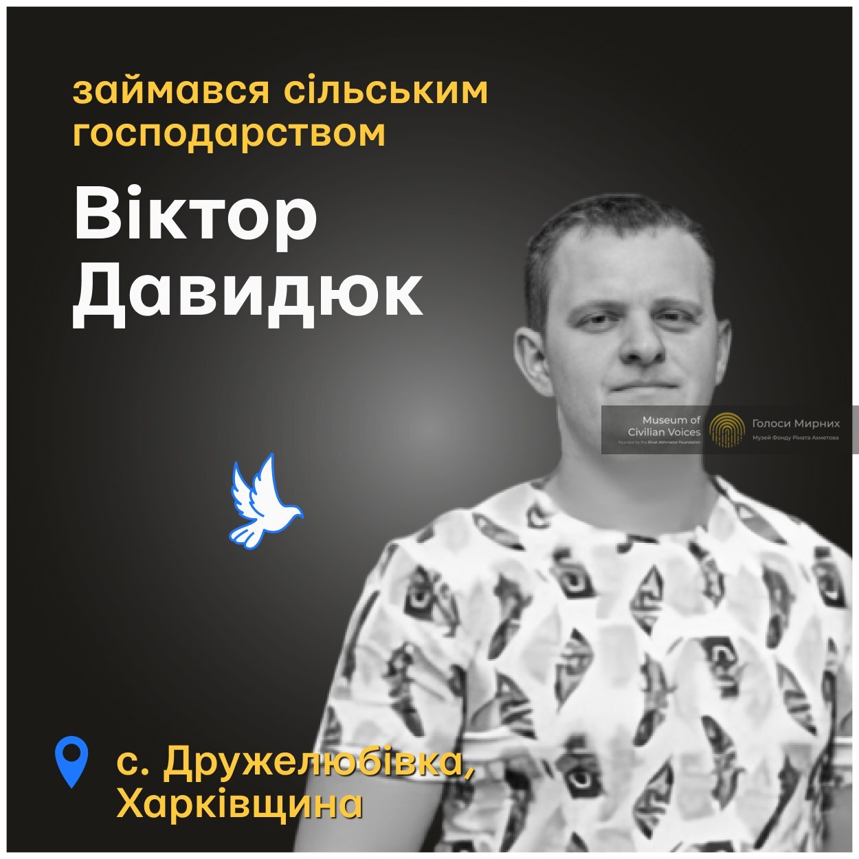 Віктор Давидюк загинув 15 жовтня 2023 року у селі Дружелюбівка на Харківщині. Російські війська обстріляли населений пункт керованими авіабомбами. Поряд загинули також батьки чоловіка. Їхні тіла знайшли того ж дня, а його самого – 18 жовтня 2023-го.