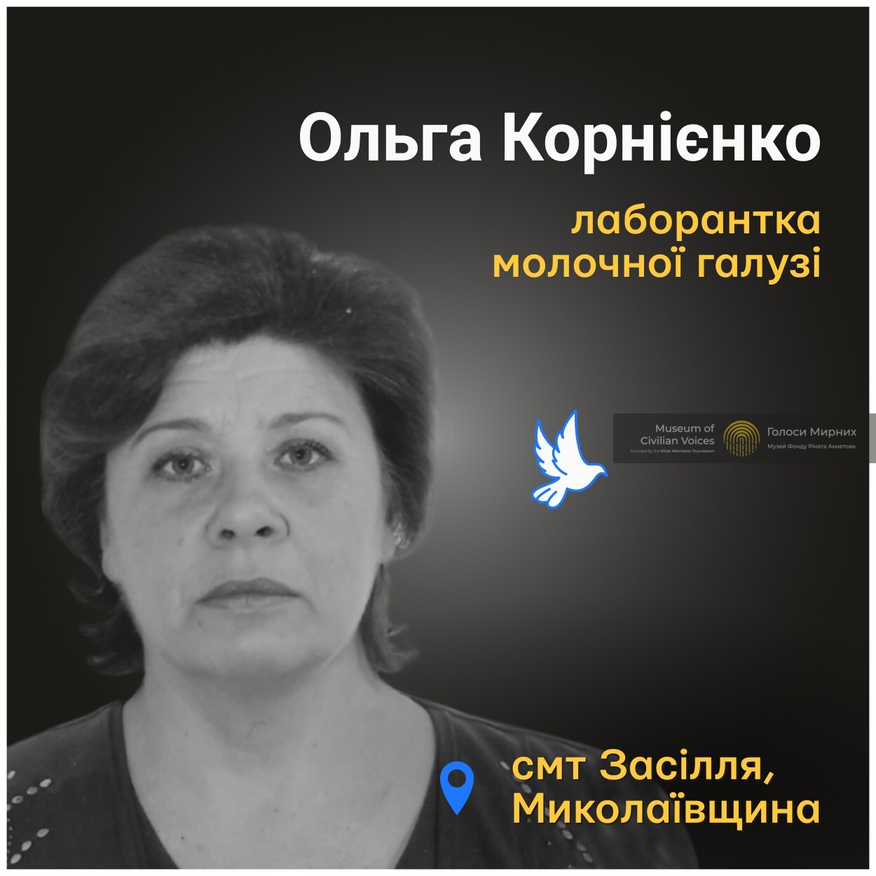 58-річна Ольга Корнієнко загинула 7 червня 2022 року в селищі Засілля на Миколаївщині. Того дня Ольга, погодувавши худобу, сіла на лавочці неподалік дому, аби перепочити, коли почався ворожий обстріл. Ольга загинула від численних уламкових поранень. Крім неї, тоді в Засіллі загинула ще одна людина.