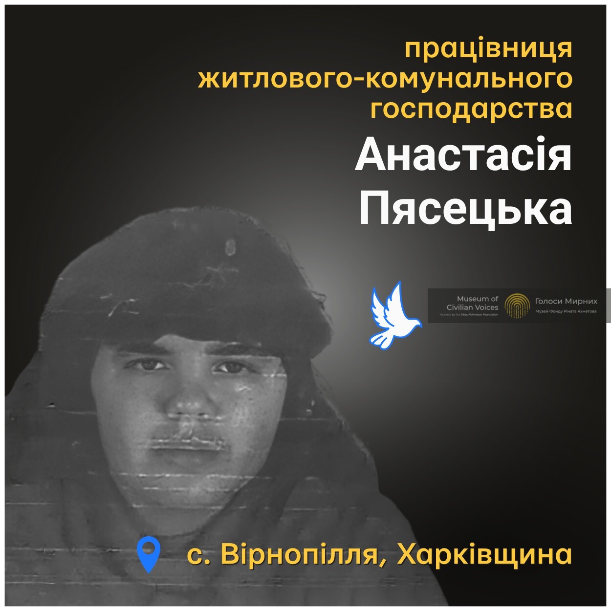 Життя 23-річної Анастасії Пясецької відібрав російський обстріл села Вірнопілля Харківської області 5 травня 2022-го. Снаряд прилетів у погріб, де вона переховувалася. Поряд загинули її мама Валентина і місцевий житель Володимир Білоногов. До нього жінки евакуювалися з Ізюма разом із сусідами.