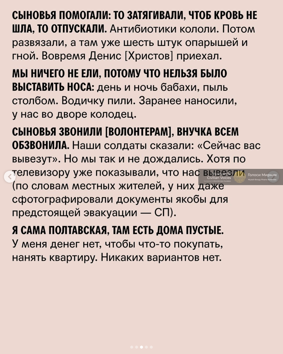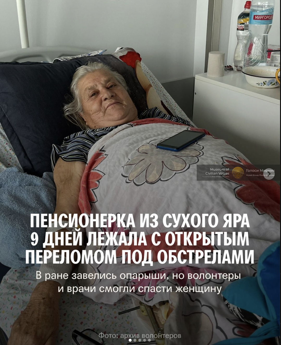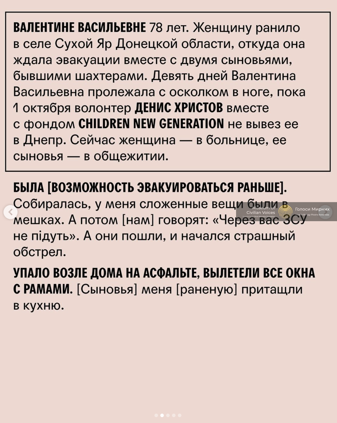 Валентине Васильевне 78 лет. Ее ранило в селе сухой яр Донецкой области, откуда она ждала эвакуации вместе с двумя сыновьями, бывшими шахтерами. 9 дней Валентина Васильевна пролежала с осколком в ноге, пока 1 октября волонтер Денис Христов вместе с фондом Children New Generation не вывез ее в Днепр. Сейчас женщина в больнице, ее сыновья — в общежитии.