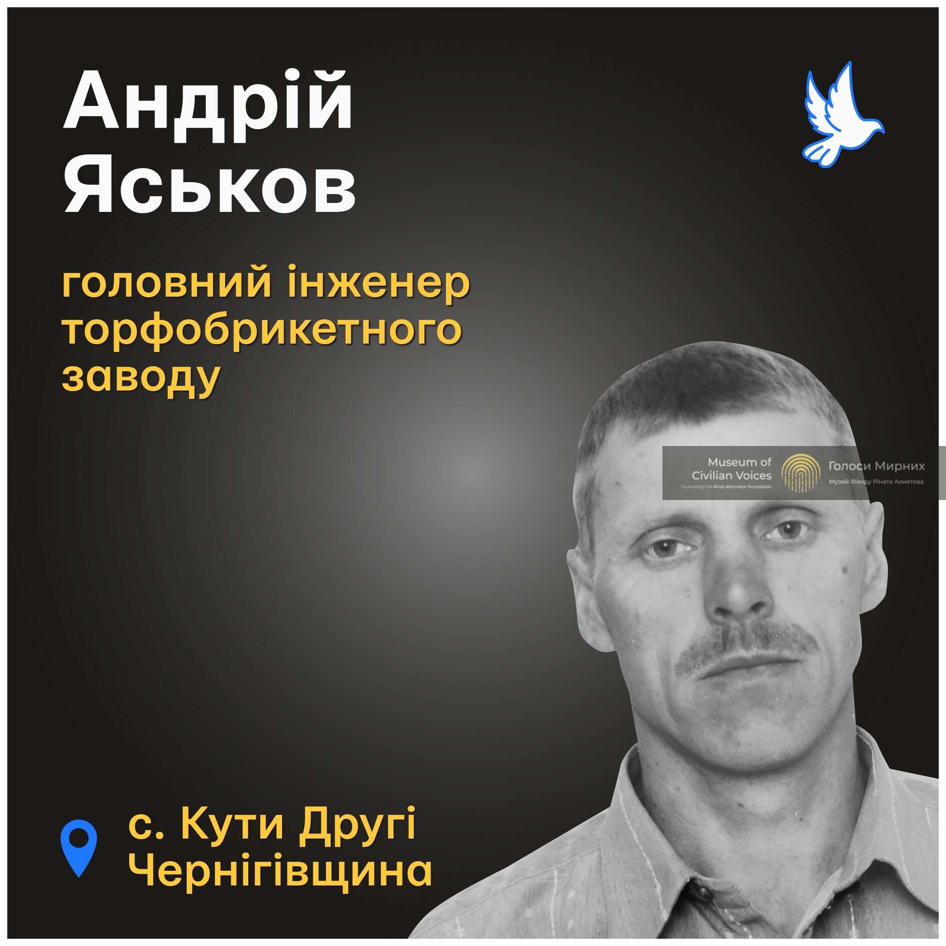 48-річний Андрій Яськов загинув 8 лютого 2023 року у селі Кути Другі, що на околиці Семенівки Чернігівської області. Дружина Ірина розповіла, що близько 15.45 російські військові скинули півторатонну керовану авіабомбу, яка влучила в депо на місцевому торфобрикетному заводі.