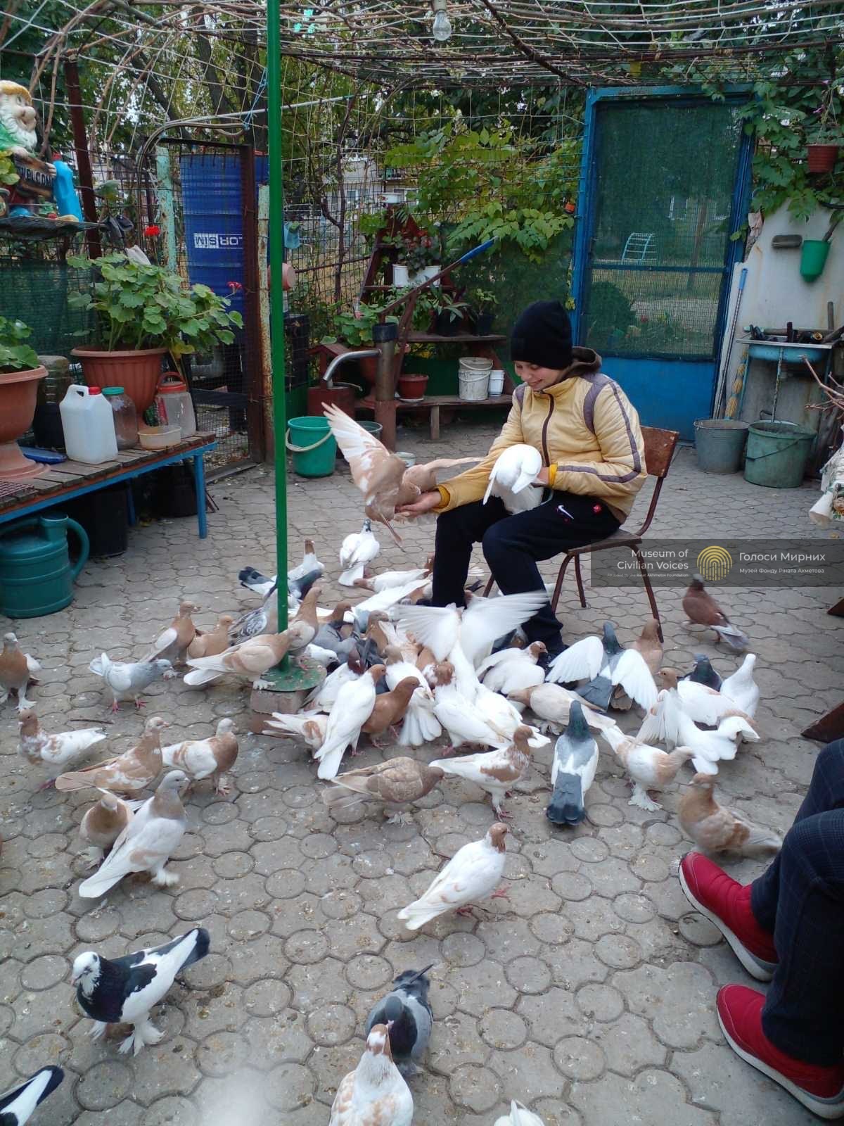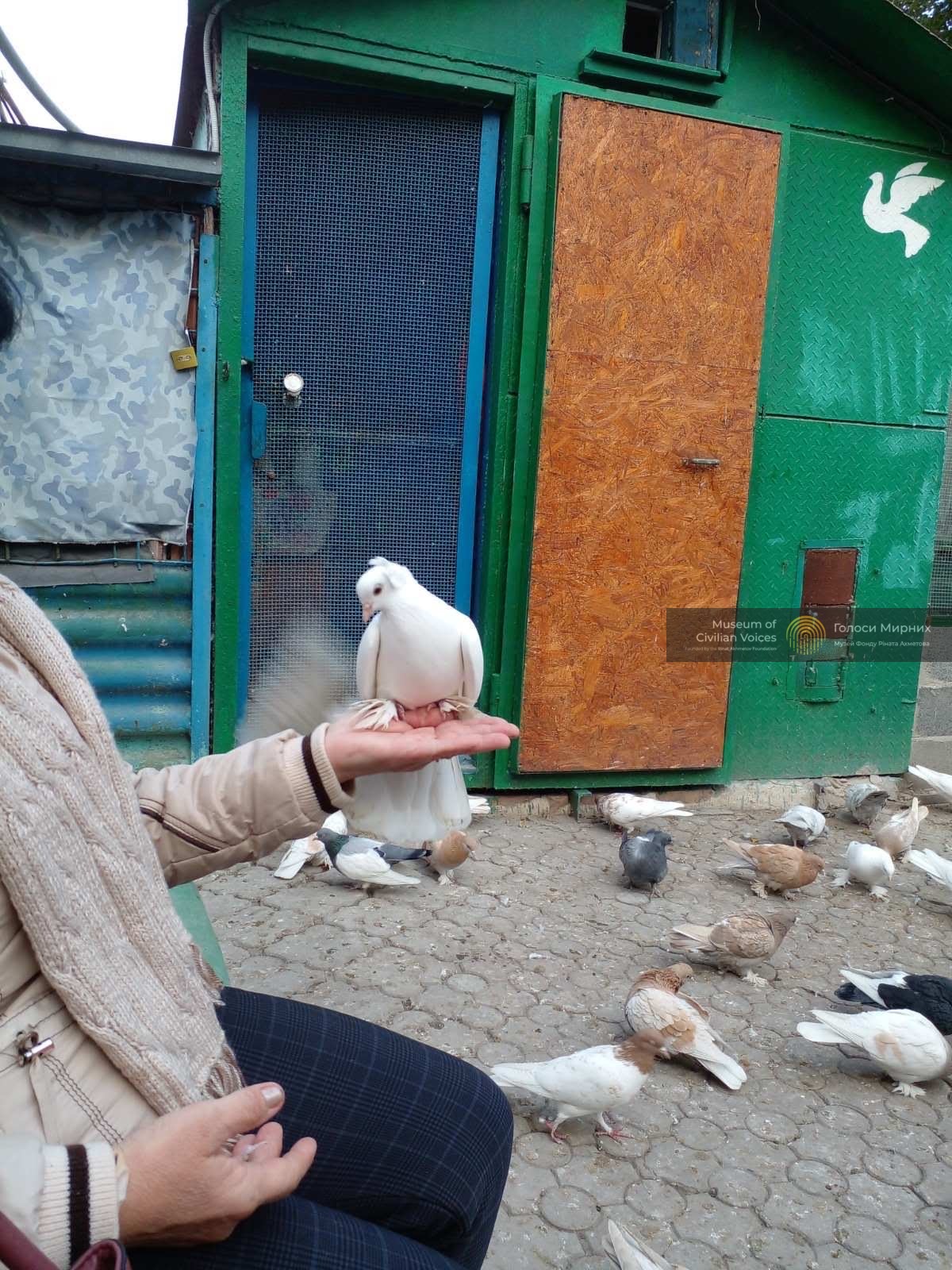 Найскладніше було з нашими голубами. У нас була голубятня – 120 виставкових порід. Планували виставку 27 лютого 2022 року, але війна все змінила. 23 лютого голуби сиділи на дереві. Ми намагалися їх підгодовувати. Але один день – і все було втрачено. Сусід, який доглядав за нашими голубами, кормив їх, загинув від прямого влучання з дрона. Це такий жах! І всі голуби загинули також, бо вже не було, кому їх годувати. Це велике горе, ми до сих пір плачемо.