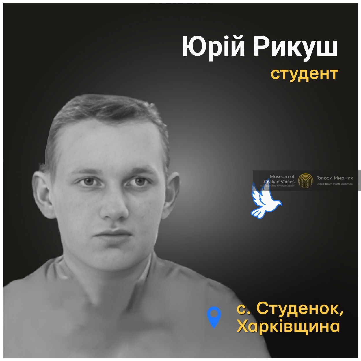 Життя 19-річного Юрія Рикуша відібрав обстріл села Студенок Ізюмського району Харківщини. 12 травня 2022 року у підвал, де він перебував із рідними, прилетів снаряд. Поряд загинули мама і 10-річна сестра хлопця.