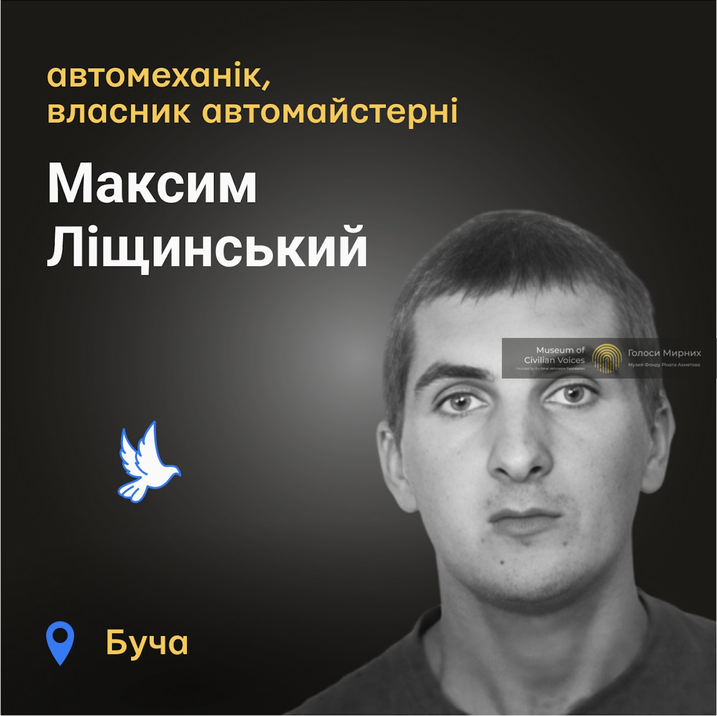 Тіло 35-річного Максима Ліщинського знайшли в квітні 2022 року у лісосмузі у Бучі. Він лежав біля своєї автівки з вогнепальними пораненнями тулуба. На задньому сидінні було тіло односельчанина Сергій Пилипенка, якому окупанти прострелили голову.