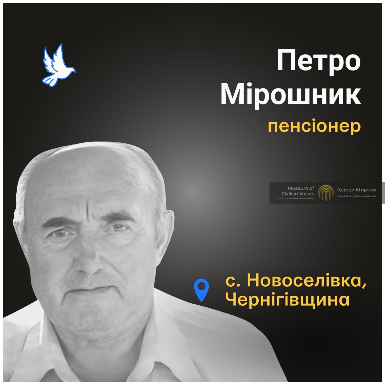 82-річний Петро Мірошник помер під час повномасштабної війни, 27 березня 2022 року, у селі Новоселівка під Черніговом. Новоселівку сильно обстрілювали, ліків і медичної допомоги, якої він потребував, не було.