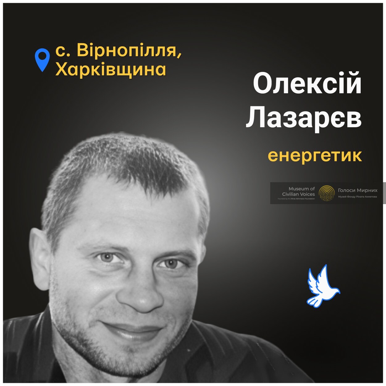 44-річний Олексій Лазарєв загинув у Вірнопіллі на Харківщині 17 квітня 2022 року. Село потерпало від обстрілів російських військових, що стояли за кілька кілометрів.