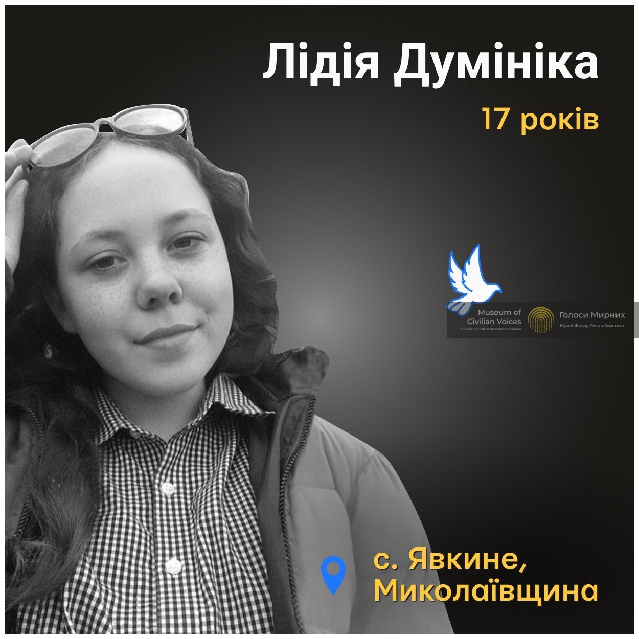 17-річна Лідія Думініка загинула в селі Явкине на Миколаївщині. 24 березня дівчина разом зі своїм хлопцем В’ячеславом потрапила під обстріл – російські військові атакували село «Смерчами». Лідію смертельно травмували уламки ворожого снаряда. Того ж дня загинуло ще двоє людей, десятеро – отримали поранення.
