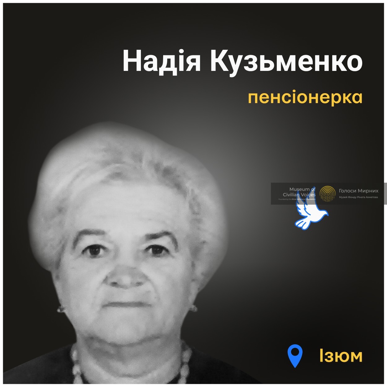 92-річна Надія Кузьменко жила в Ізюмі на Харківщині. 6 травня 2022 року разом зі своїм правнуком Іваном Бауером вона поралась на господарстві, коли почався черговий ворожий обстріл. Росіяни атакували Ізюм касетними боєприпасами – Надія та Іван загинули.