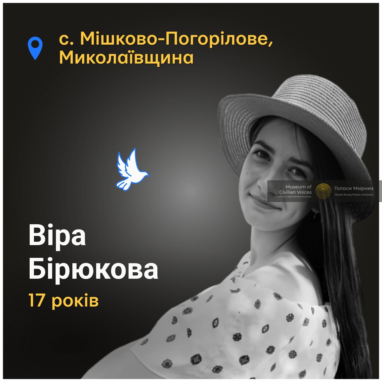 Життя 17-річної Віри Бірюкової відібрав ворожий обстріл села Мішково-Погорілове на Миколаївщині. 5 березня 2022-го снаряд, який випустила російська армія, вибухнув біля її дому. Від того обстрілу загинула також трирічна сестра дівчини Аріна.