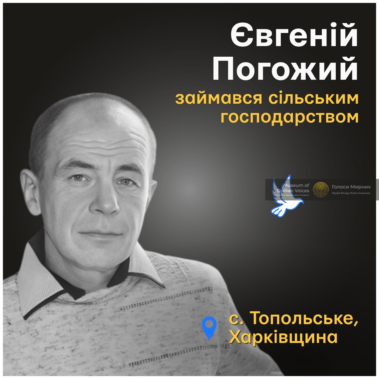 Життя 50-річного Євгенія Погожого відібрала російська армія. Вранці 8 березня 2022 року ворог скинув авіабомбу на його подвір’я у селі Топольське Харківської області. Напередодні ввечері у небі над Топольським бачили розвідувальний дрон.