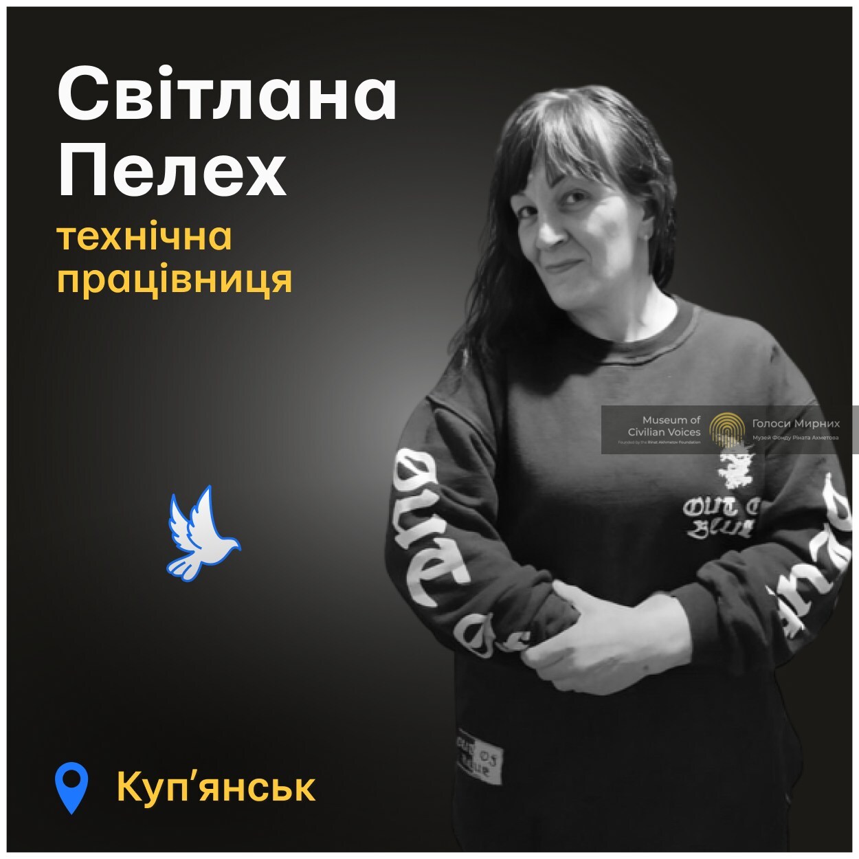 Життя Світлани Пелех відібрав російський обстріл Купʼянська Харківської області 17 лютого 2024 року. Лише з 13:00 по 13:40 ворог скинув на місто понад десять бомб. Зокрема – на житловий багатоквартирний будинок. Поряд зі Світланою нею загинув цивільний чоловік Віктор Цуканов.