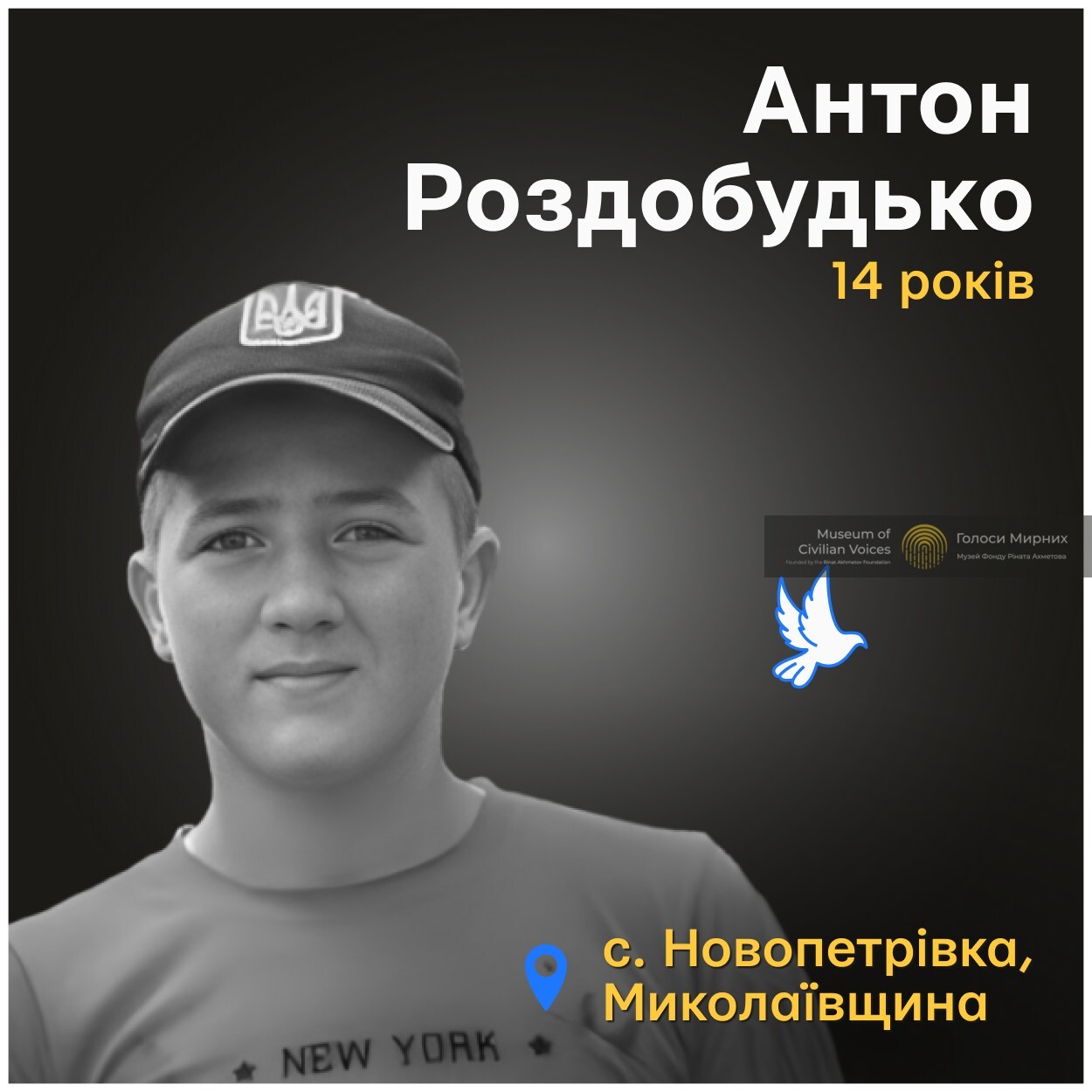 14-річний Антон Роздобудько загинув 15 жовтня 2023-го у селі Новопетрівка на Миколаївщині. Він із другом ішов до ставка. Біля залізничної колії Антон узяв у руки шматок пластику. Виявилося, що це компонент від вибухонебезпечного предмета, залишений після окупації села російською армією. Пролунав вибух, який забрав життя юнака.