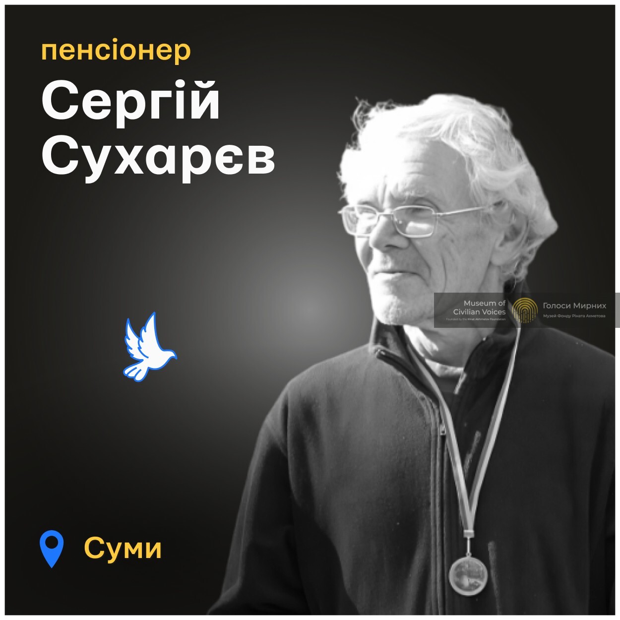 Життя Сергія Сухарєва відібрав російський обстріл міста Суми 17 листопада 2024 року. Сергій був удома, у своїй кімнаті, коли російська армія вдарила по теплопункту, що поряд із його будинком. Вибуховою хвилею вибило вікно, уламок скла перерізав сонну артерію чоловіка.