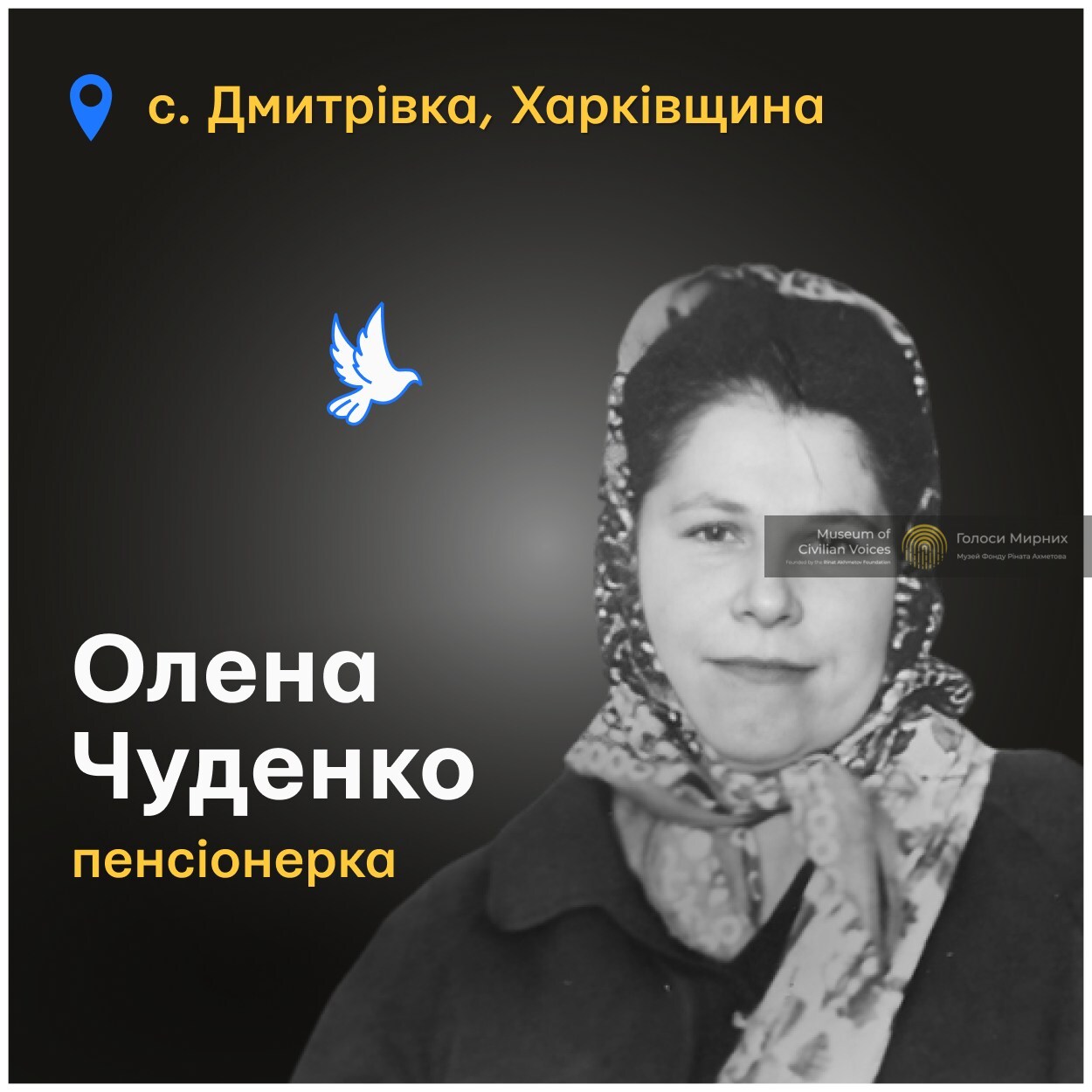 72-річна Олена Чуденко загинула у власному будинку у Дмитрівіці Ізюмського району Харківської області. Того дня, 10 квітня 2022 року, російські військові розстріляли з танків упритул кілька будинків у Дмитрівці. Один зі снарядів поцілив по оселі Олени.