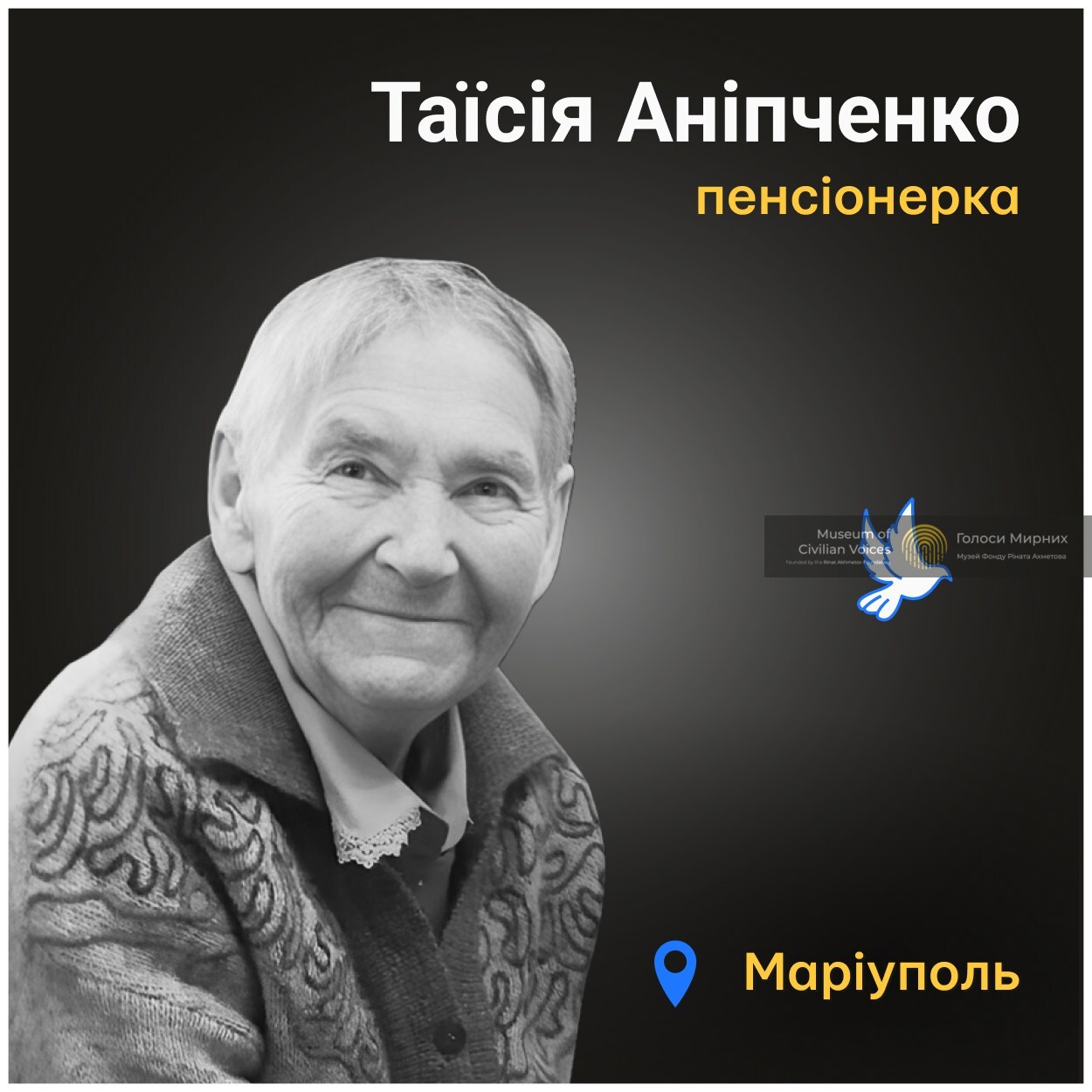 Життя 81-річної Таїсії Аніпченко обірвалося 4 березня 2022-го у Маріуполі. Вона лікувалася у 9-ій міській лікарні під кисневим апаратом. Внаслідок обстрілу російськими військовими центральної підстанції у місті зникло світло, подача кисню припинилася. Через це Таїсія Аніпченко померла.