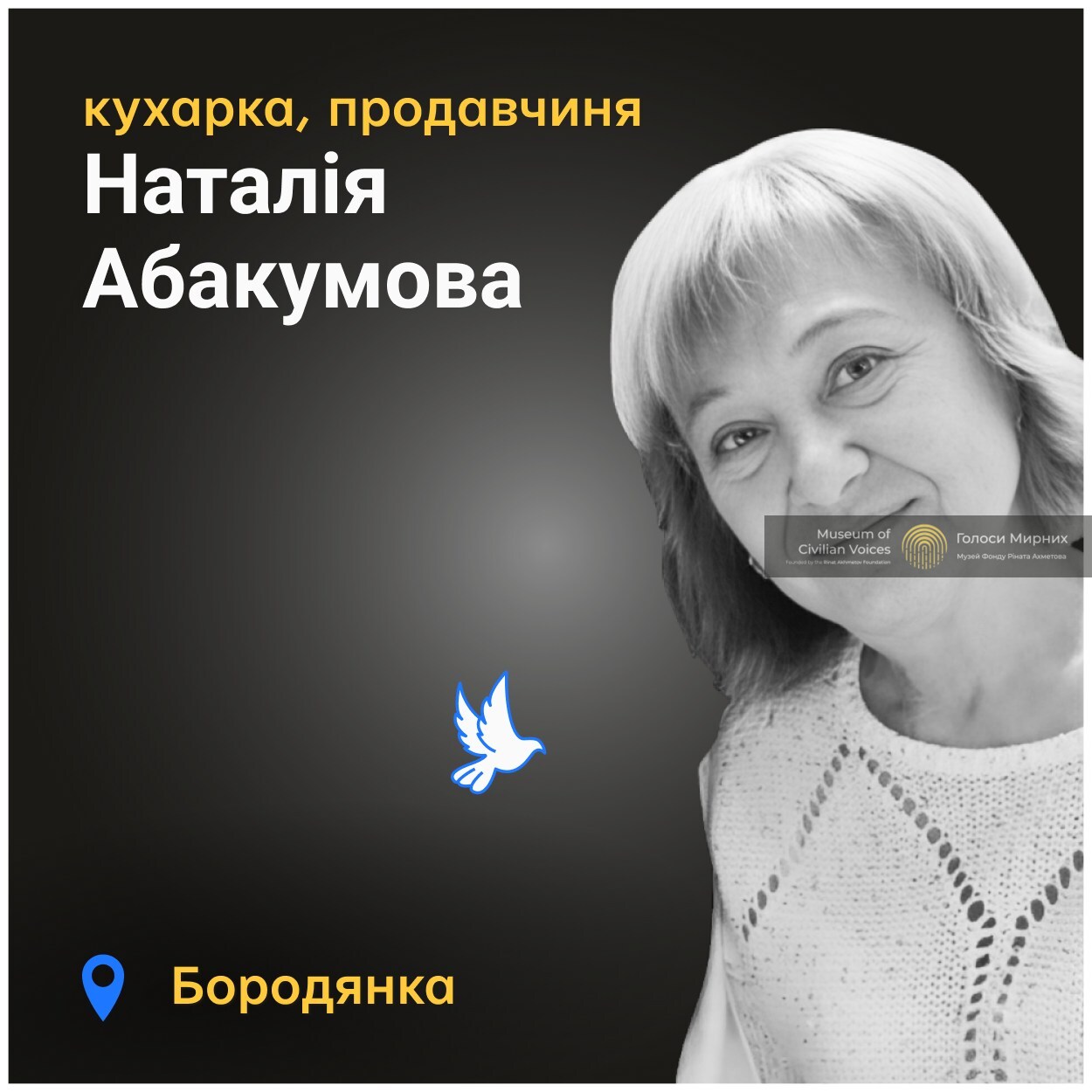 2 березня 2022 року російська авіація завдала авіаудару по житловій багатоповерхівці на вулиці Центральній, 359 у Бородянці. Там мешкали Наталія Абакумова з чоловіком Юрієм. Дружина була в укритті, утім вибігла звідти перевірити, як почувається чоловік – він після інсульту пересувався на візку й спускатися в підвал не міг. У той час, як Наталія вийшла з укриття, ворог вдарив по житловому будинку.