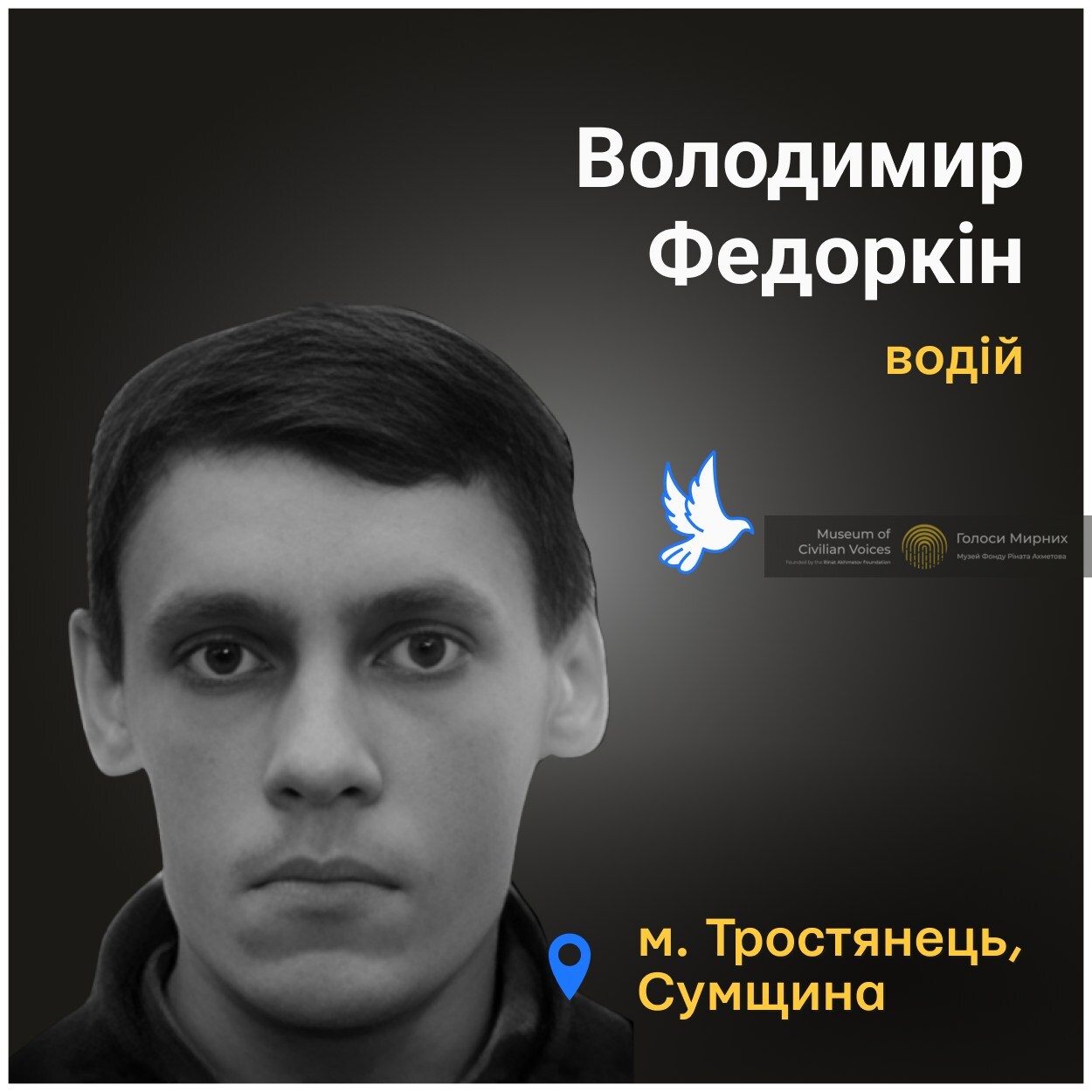 Володимир Федоркін загинув 28 лютого 2022 року в Тростянці на Сумщині. Того дня чоловік не повернувся додому з роботи. 1 березня його тіло виявили на дорозі, у Володимира були вогнепальні поранення.
