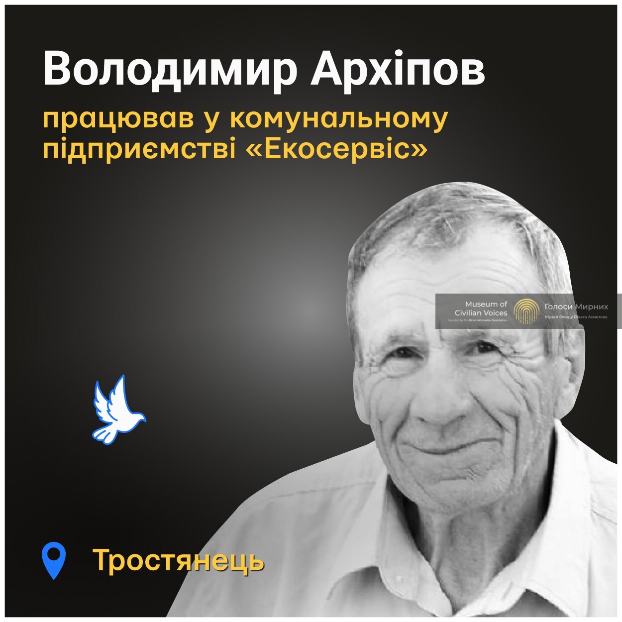 70-річний Володимир Архіпов загинув 17 березня 2022 року в Тростянці на Сумщині. Чоловік вийшов зі свого дому на подвір’я, коли раптом почався обстріл. Володимир отримав важкі поранення від розриву снаряда, його життя не вдалося врятувати.