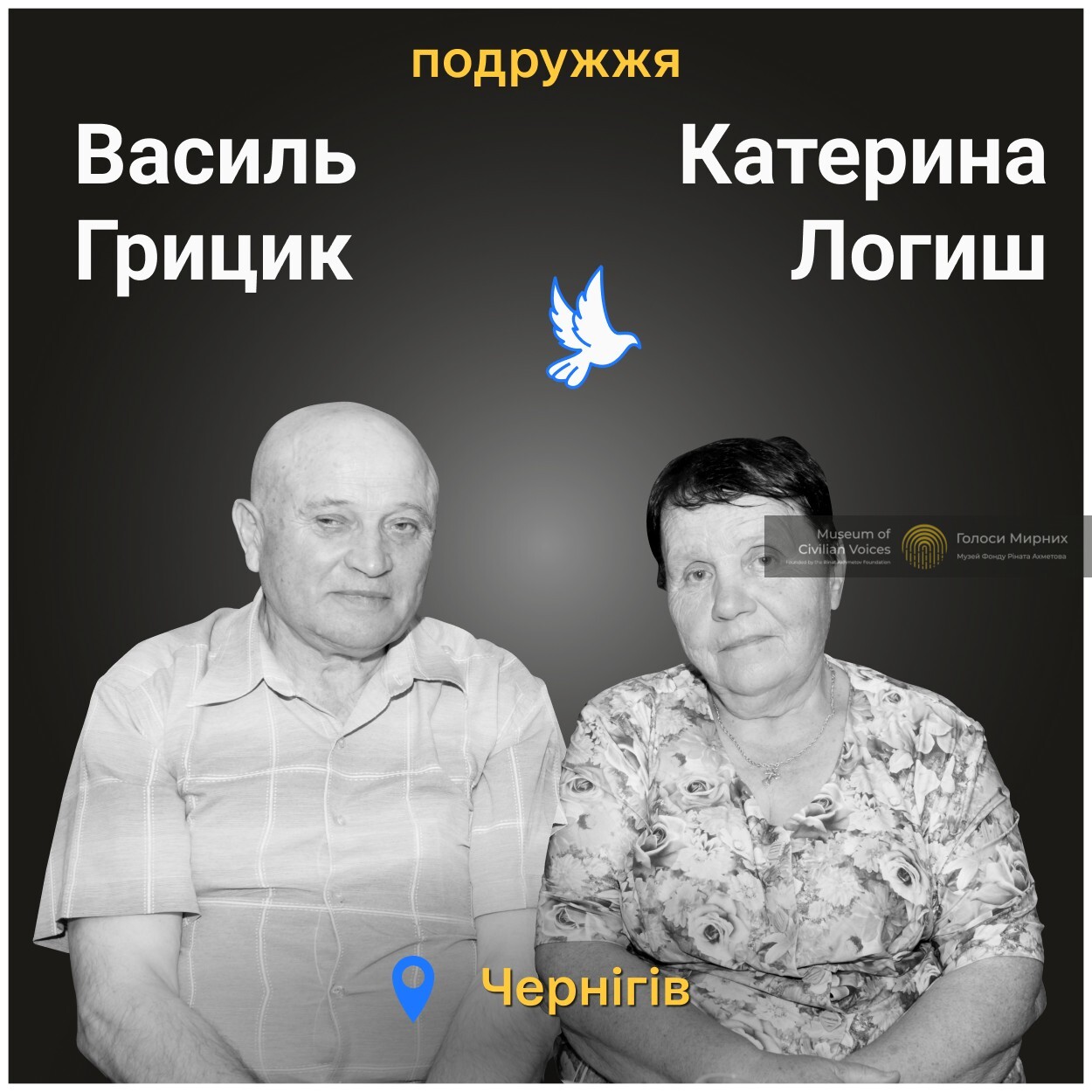 Катерина Григорівна була родом із села Андріївка, а Василь Федорович народився у селі Підлісне Чернігівської області. Жила подружня пара у Чернігові. Катерина Григорівна та Василь Федорович до пенсії працювали у сфері будівництва. Рідні загиблих розповіли, що подружжя брало участь у спорудженні, зокрема, відомого в місті 21-поверхового готелю «Градецький».