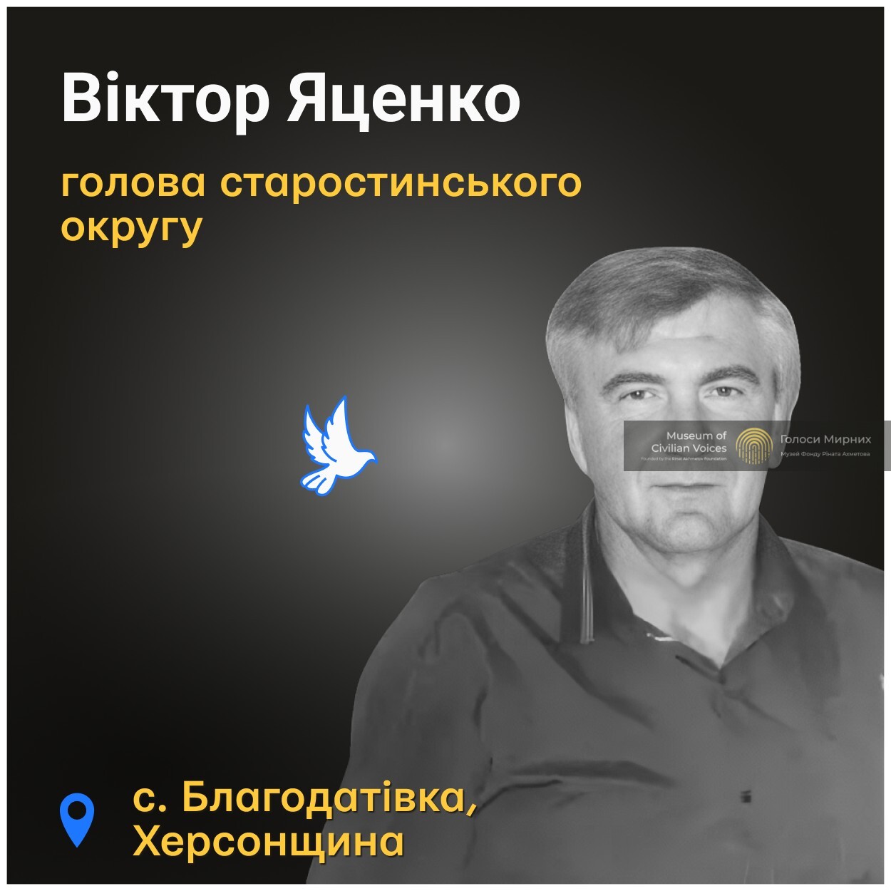 60-річний Віктор Яценко загинув 6 червня 2022 року в рідному селі Благодатівка на Херсонщині. Він повертався з гуманітарною допомогою для односельців, коли уламок ворожої ракети влучив у його авто.
